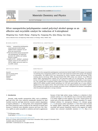 2 | 一等奖 | 基于对硝基苯酚还原反应的海绵负载纳米银催化材料 | 郭明明、张亚、薛博中、王雄 | 张云飞 杜飞鹏 |