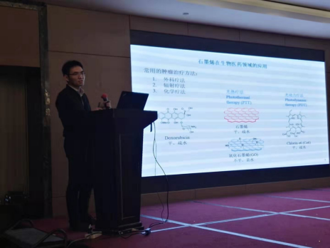 刘刚在会上汇报了课题组在肿瘤光动力/光热联合治疗领域的研究进展。课题组开发了一种基于超分子化学的、一步制备石墨烯/光敏剂复合物(载药体系)的方法,该载药与基于氧化石墨烯(GO)的载药体系相比,具有载药量高(比GO提高10倍以上)、制备过程简单等优点。细胞实验表明,该载药系统杀死肿瘤细胞的能力比使用其他纳米药物载体最高提高了75倍,具有较大的应用前景。