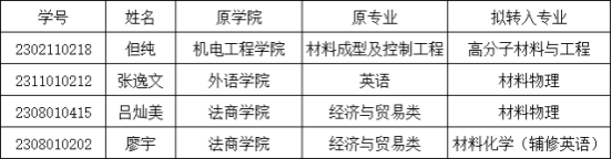 根据《武汉工程大学普通本科生转专业实施办法》武工大教发【2022】4号文件和教务处《关于做好2023-2024学年第一学期普通本科生转专业工作的通知》的有关要求,经学生本人提交申请书,填写“材料科学与工程学院本科生转专业、转学学分认定审批表”,学院根据本学院专业转入的规定条件,对申请学生的转专业资格进行审核及面试,确定以下拟转入名单,并给予公示。