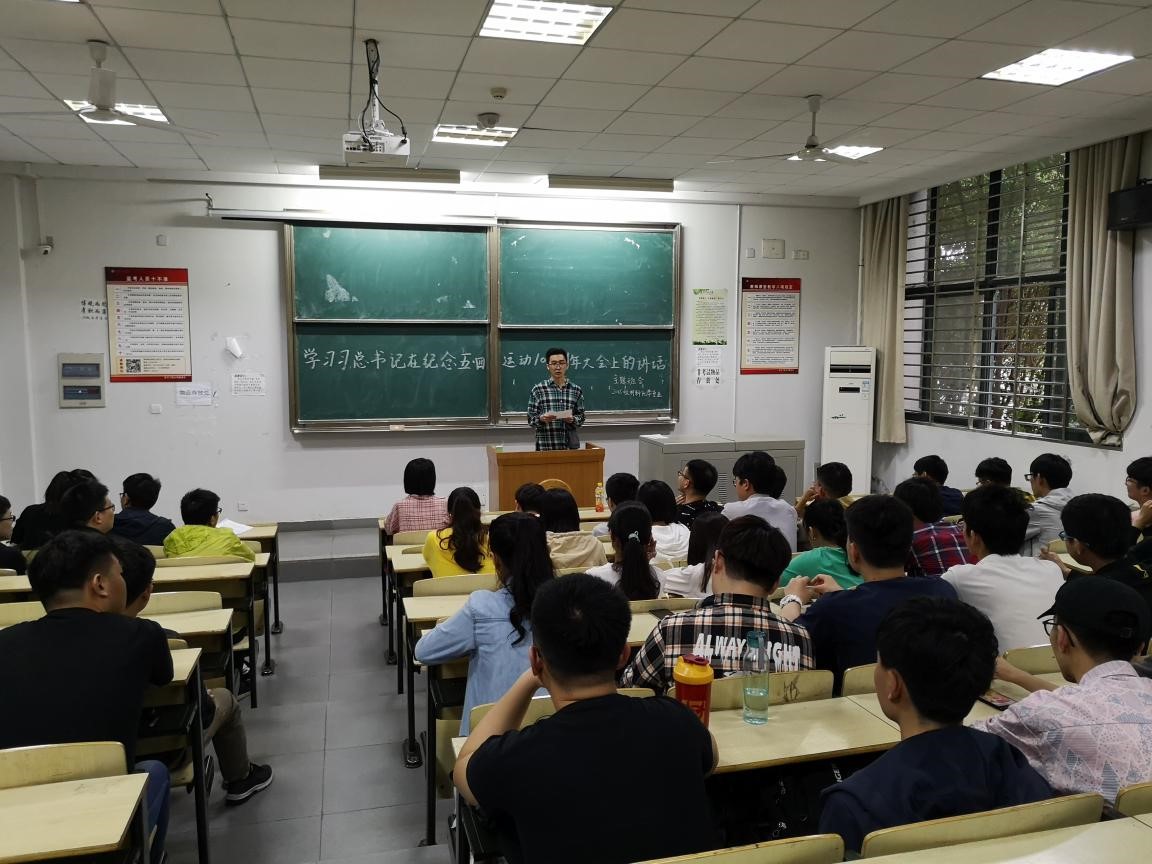 为加强学生的思想政治教育,传承并弘扬“五四精神”,5月16日下午,材料科学与工程学院2016级材料化学班在L4114教室开展了学习习近平总书记在纪念五四运动100周年大会上的讲话主题班会,校组织部陈恩雨老师、2016级辅导员吴丕业老师以及两个班级全体同学出席了班会。主题班会由陈恩雨老师主持。
