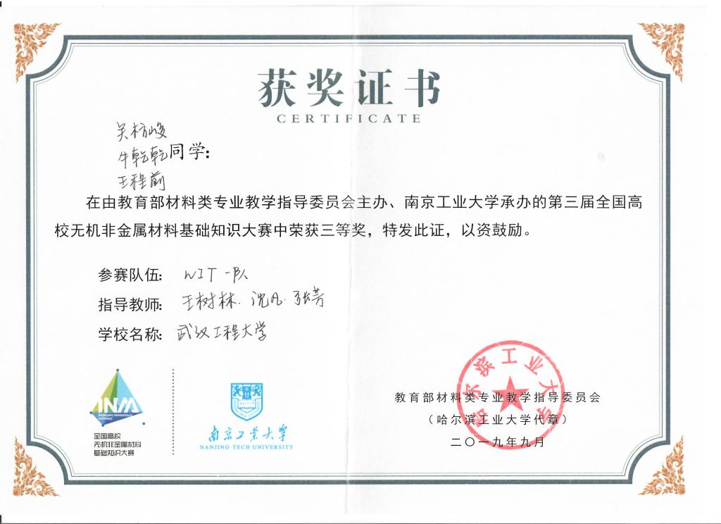 bw必威西汉姆联官方网站材料学院派出无机非金属材料专业学生陈炳才、张天宇、胡淼组成的WIT二队(指导老师:沈凡 王树林 张芳)和吴枋峻、王程前、牛乾乾组成的WIT一队(指导老师:王树林 沈凡 张芳)参加了本届大赛,在众多高校的激烈竞争中,bw必威西汉姆联官方网站两支参赛队伍双双获奖。大赛分为预赛和决赛两个环节,在预赛环节bw必威西汉姆联官方网站两支参赛队表现优异,其中WIT二队在126支参赛队伍中以总排名第4的成绩进入到决赛环节,并在决赛中脱颖而出,斩获一等奖,展现了bw必威西汉姆联官方网站学子扎实的专业基础和勇创争先的精神,也凸显了学校对专业基础知识教学的高度重视。