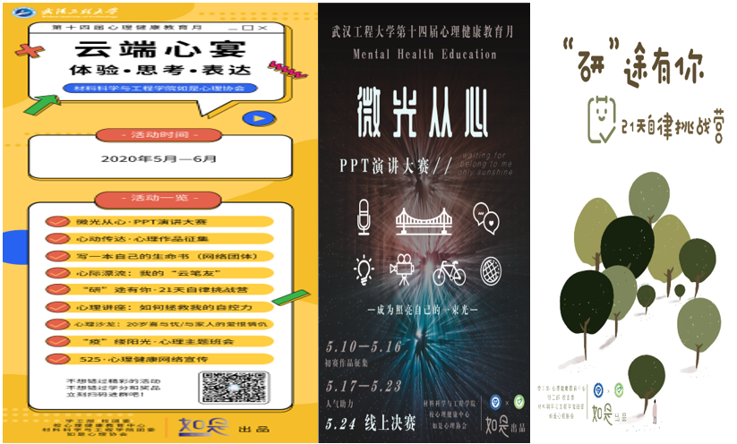 孟夏五月,绿草青青,杨柳依依,疫后的工大校园里略显冷清,然而工大校园网上却是异常忙碌和热闹,网络家庭心理情景剧震撼来袭、微光从心线上PPT演讲大赛精彩纷呈、心动传达心理作品展示绘声绘色、云端专家心理讲座沁人心脾、心理援助QQ热线频繁闪烁,还有轻松愉快的时光邮局和心理树洞等活动。