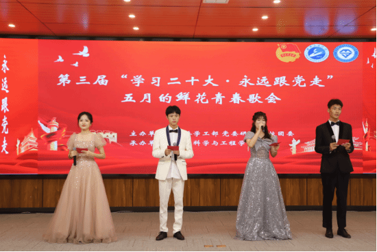 本网讯(通讯员 张茜 热孜瓦古力)5月6日晚18:30,武汉工程大学第三届“学习党的二十大·永远跟党走”暨五月的鲜花青春歌会在图灵报告厅成功举行。本次活动由党委学工部、党委研工部、校团委主办,材料科学与工程学院承办,校党委副书记李志旭、党委学工部部长吕容涛、党委研工部副部长陈朝娟、校团委副书记翟莹、材料学院党委书记王涛、院长江学良、马克思主义学院党委副书记陈俊、材料学院党委副书记张琼、高材系主任游峰老师以及学工办全体辅导员、荣获“五四”表彰荣誉的先进集体和个人代表、2022级全体学生欢聚一堂。晚会线上线下同步进行。
