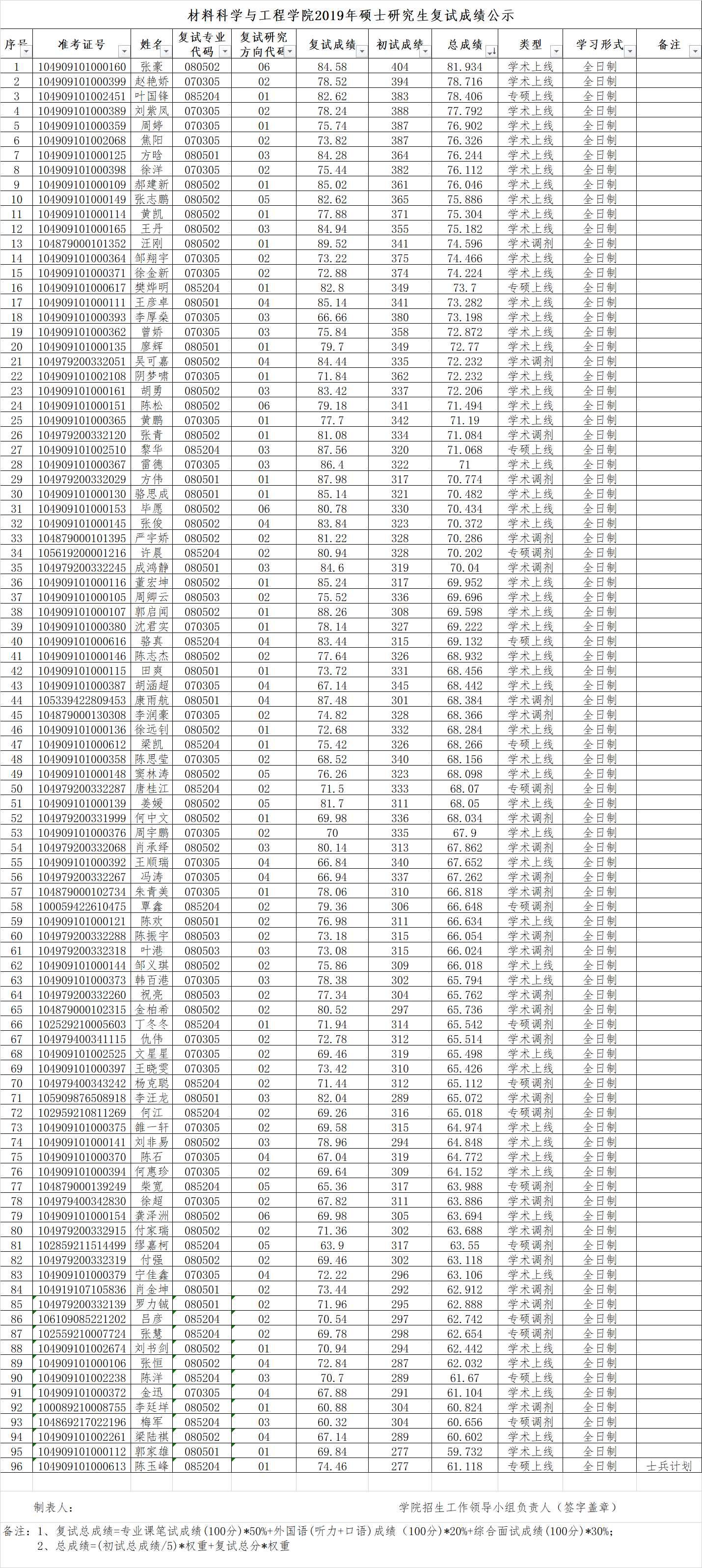 材料科学与工程学院2019年硕士研究生复试成绩公示