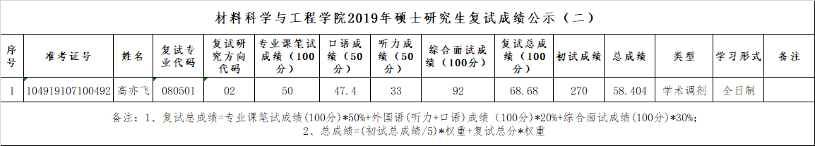 材料科学与工程学院2019年硕士研究生第二批复试成绩公示