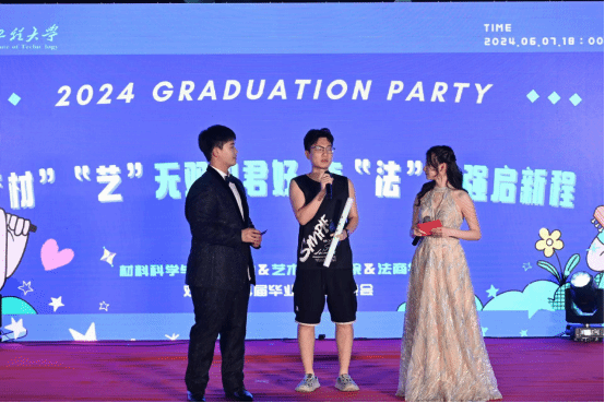 6月7日晚,材料学院、艺术学院、法商学院联合举办的“‘材’‘艺’无双祝君好,奋‘法’图强启新程”2024届毕业生师生联欢晚会在知博广场圆满举办,校党委学工部部长严敏,校党委研工部副部长陈朝娟,校团委副书记邓欢、挂职书记王祥礼,材料学院院长江学良、党委副书记张琼,艺术学院党委副书记王超,法商学院(知识产权学院)党委副书记孙勇、副院长付书科以及三个学院的毕业班班主任代表、导师代表,全体辅导员,1000余名本硕毕业生参加了本次活动,活动现场,流光溢彩,欢声笑语,其乐融融,氛围热烈。
