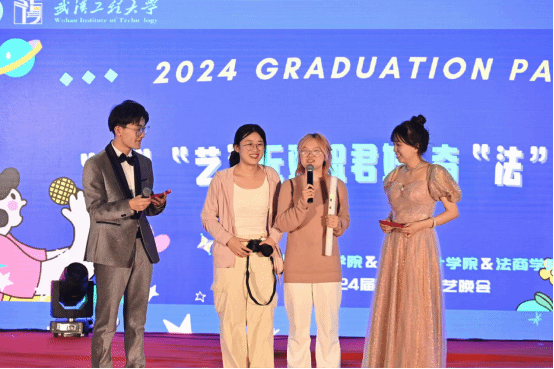 本次晚会由材料学院毕业生朱朵儿、刘伟栋,艺术学院毕业生胡明月以及法商学院在校生刘宇轩主持。