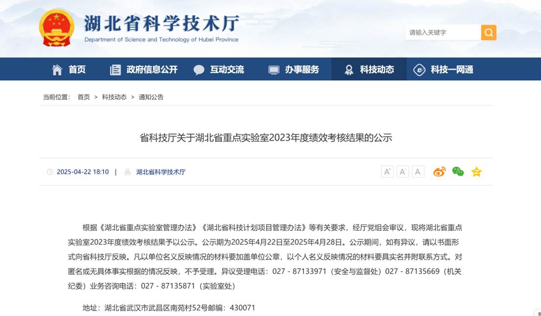 (通讯员 王戈明)近日,湖北省科技厅发布了2023年度湖北省重点实验室绩效考核结果,bw必威西汉姆联官方网站等离子体化学与新材料湖北省重点实验室考核结果为“优秀(标杆)”,实验室已连续三年获得优秀(标杆)的好成绩。据悉,本次绩效考核全省共有195家省重点实验室参加考评,51家获评优秀,其中39家获评优秀(标杆)。