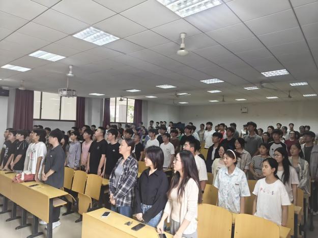 下午2点,伴随着激昂雄壮的《义勇军进行曲》,全体学生,昂首肃立,高唱国歌。嘹亮的歌声回荡在教室的每一个角落,眼神中的坚定与崇敬,既是对革命先烈的深切缅怀,也是对民族精神的传承接力。学院通过庄重的仪式感,让学生在旋律中重温历史、凝聚力量,为后续的思政大课学习奠定了浓厚的情感基础。
