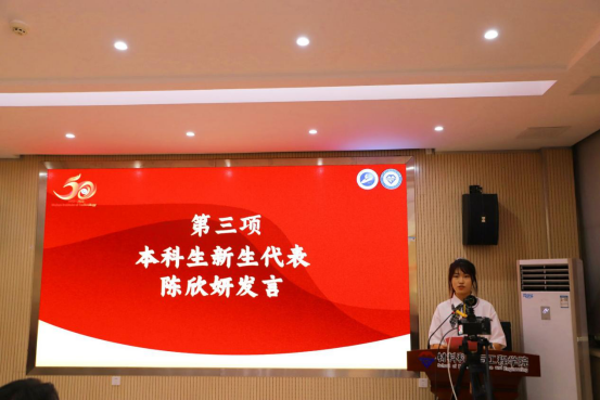 高分子材料与工程专业的陈欣妍代表本科新生发言,她表示大学期间要踏踏实实的过好每一天,时刻将每天作为新的起跑线,飞出温暖的巢穴,以雄鹰之力搏击长空,为实现人生理想而努力奋斗。