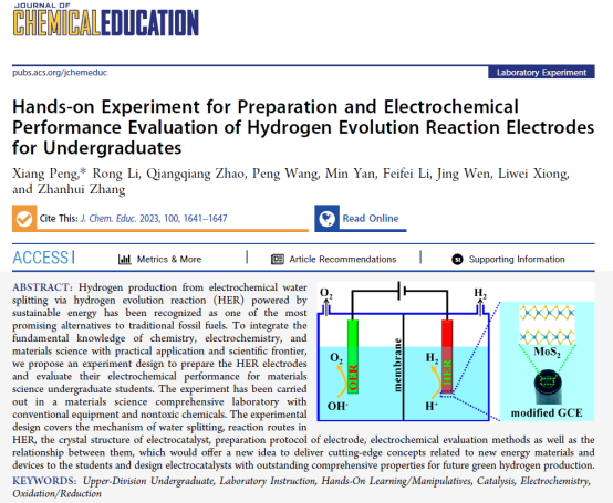 本网讯(通讯员 屈丹)近日,材料学院新能源材料与器件系彭祥老师以第一作者和通讯作者在国际著名期刊《Journal of Chemical Education》上发表教研论文《Hands-on Experiment for Preparation and Electrochemical Performance Evaluation of Hydrogen Evolution Reaction Electrodes for Undergraduates》,bw必威西汉姆联官方网站新能源材料与器件系是该论文的唯一署名单位。该期刊是美国化学会于1924年创办,是化学教研类国际顶级SCI期刊。