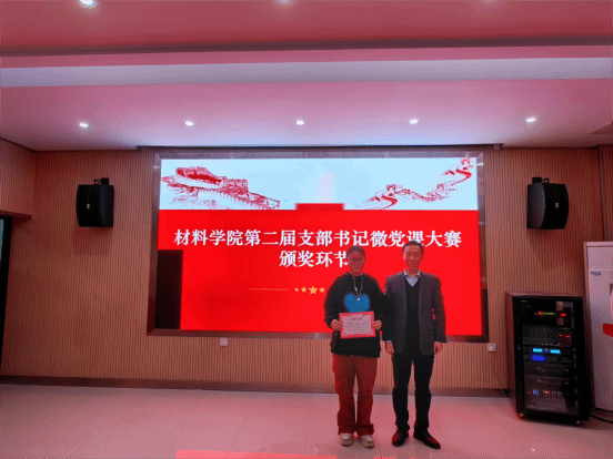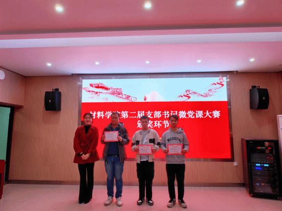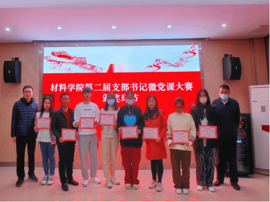 杨海波、陈恩雨等分别为获奖选手颁奖并合影留念。本次决赛角逐出一等奖1名,二等奖3名,三等奖5名和优秀奖8名,材料物理系党支部的邓泉荣老师获得本次微党课大赛的第一名。