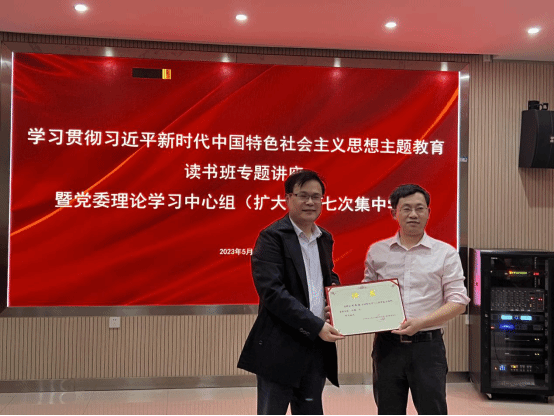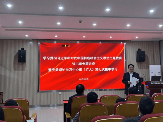 (通讯员 熊兆胜男)5月23日下午,材料学院在326报告厅开展学习贯彻习近平新时代中国特色社会主义思想主题教育读书班专题讲座暨党委理论学习中心组(扩大)第七次集中学习。特邀华中科技大学马克思主义学院副院长沈昊驹做专题报告。党委委员、党支部委员、民主党派支部委员、团委委员、团支部委员、一站式学生社区管理委员会委员组成的“六委员”代表参加学习,报告由学院党委书记王涛主持。