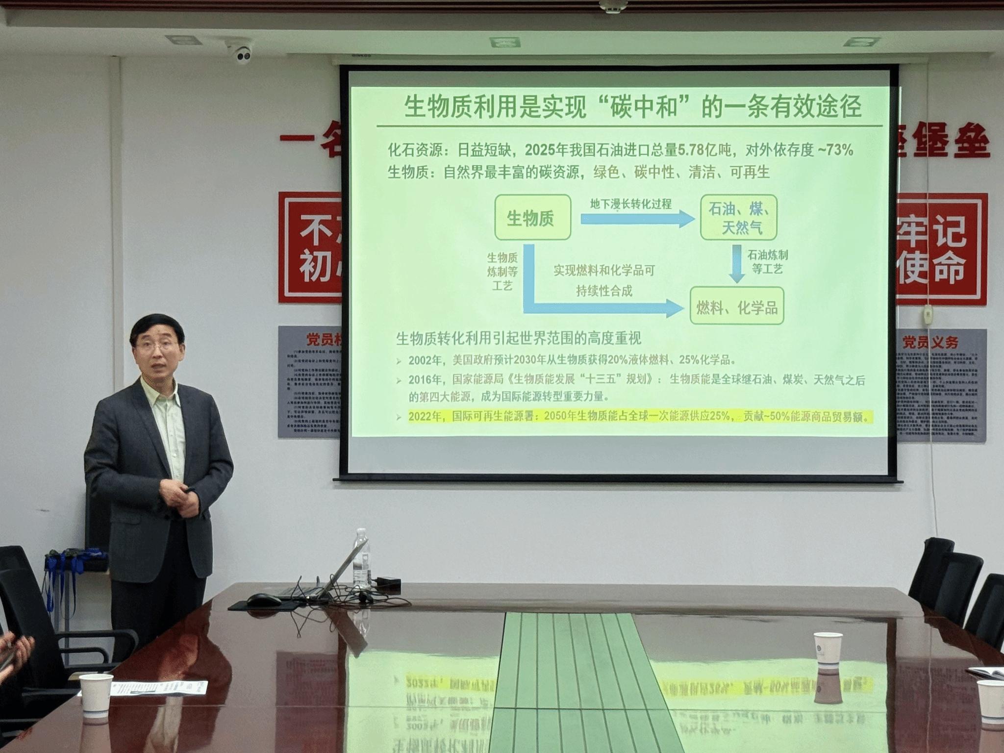 刘海超教授围绕生物质高效催化转化这一主题,系统介绍了木质纤维素转化利用、葡萄糖及呋喃类衍生物催化选择氢解合成重要化学品等方面的系列研究进展,深刻阐述了充分利用生物质资源在实现“碳中和”目标中的关键作用,为在场师生开展相关领域研究提供了清晰的思路与重要的理论参考。整场报告内容丰富、观点鲜明,赢得了在场师生的热烈掌声。