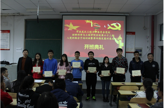 (通讯员 张义强)11月6日中午12点,中共武汉工程大学委员会党校材料科学与工程学院分党校第62期入党积极分子培训班暨第4期发展对象培训班开班典礼在流芳校区4302教室举行。学院党委书记、院长刘治田、党委常务副书记李国林、党委副书记肖平以及学院全体辅导员出席开班典礼。开班典礼由本期党校培训班班主任张义强老师主持。