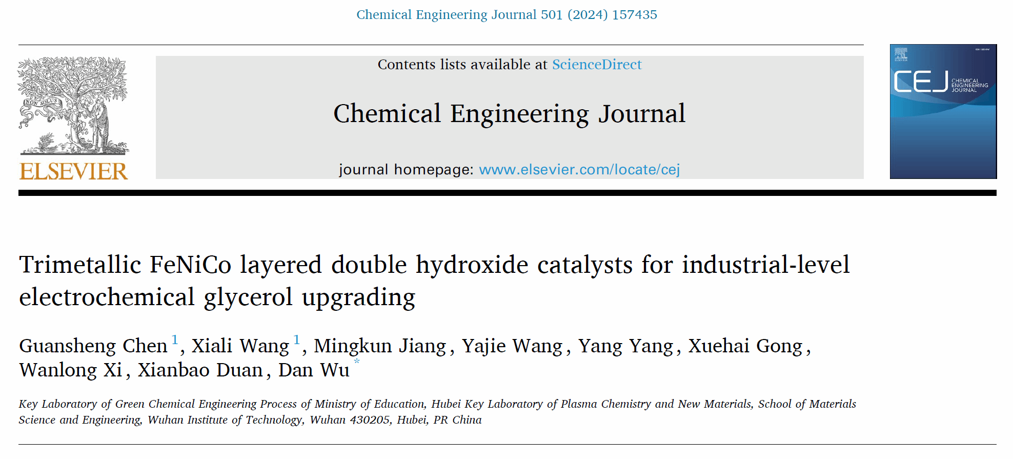 本网讯(通讯员 陈冠生 吴丹)材料科学与工程学院吴丹教授指导学院2021级本科生陈冠生等人,以第一作者在国际著名期刊Chemical Engineering Journal上发表了题为《Trimetallic FeNiCo layered double hydroxide catalysts for industrial-level electrochemical glycerol upgrading》的研究论文。该期刊为化工领域的中科院SCI一区top期刊,最新影响因子为13.3。bw必威西汉姆联官方网站为第一通讯单位,吴丹教授为唯一通讯作者,材料科学与工程学院段献宝教授提供了理论计算支持。