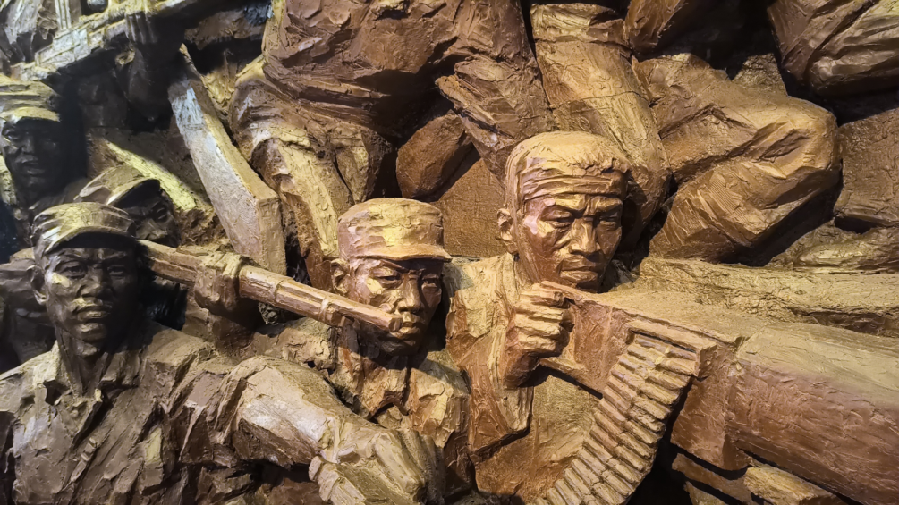 步入纪念馆,“救亡图存”展厅以丰富的展陈再现了百年党史的壮阔历程。栩栩如生的浮雕、历经沧桑的文物,将成员们带回那段风雨如磐的年代。泛黄的照片映照出近代中国的屈辱与挣扎,冰冷的柱状数据刻录着不平等条约下的民生疾苦。从虎门销烟的奋起反抗到辛亥革命的艰辛求索,中国人民救亡图存的脚步从未停歇,却始终未能改变旧中国积贫积弱、内忧外患的局面。