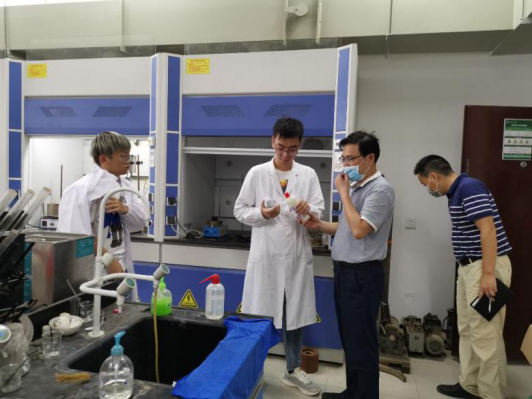 对照“材料科学与工程学院实验室安全管理规定”,李书记一行对实验室的卫生状况、化学药品的摆放、化学废液废料处理、实验室安全隐患等进行了专项检查。