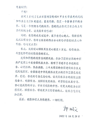 杨佳峰现场朗读了郭先生写给贾鑫的信。郭先生在信中写到“你是一个懂事孝顺的女孩、又是一个积极乐观的女孩、你的做法体现了社会向上向善的积极力量、让我们非常感动!同时,在你的成长记忆中、很多有爱心的人、你所在的武汉工程大学、你母亲所在的物业公司都给予你们以关心和帮助,给大家点赞!光荣和骄傲的我作为列席代表、参加了震惊世界的中国共产党第二十次全国代表大会,聆听了习近平总书记的报告,心潮澎湃,热血沸腾.二十大擘画的全面建设社会主义现代化国家、全面推进中华民族伟大复兴的宏伟蓝图己经展开,前进、奋进的号角已经吹响。让我们在各自的岗位上团结奋斗、有作有为,为国家发展助力,希望你能认真学习,安心完成学业,早日实现梦想,有更大的能力去汇报家庭、回报社会,帮助更多需要帮助的人,让社会变得更加美好”。