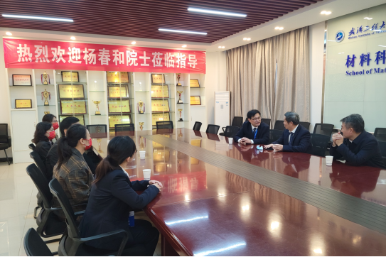 王涛向杨院士汇报了学院党建、科研、专业建设以及人才培养的基本情况,一行人陪同院士参观了等离子体化学与新材料湖北省重点实验室,马志斌教授与院士交流了科研进展情况。