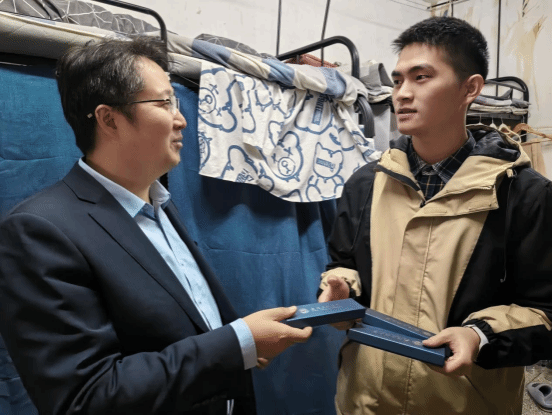 王涛代表学院表达了对考研同学们的关心与祝福,他亲切与同学们交谈,了解大家的复习状态,鼓励考研学子们在最后的冲刺阶段做好统筹,合理安排各科的复习时间;抓好重点,在自己擅长的部分抓紧提分;调好状态,室友之间要互相加油打气不断提升信心,最后王涛向同学们赠送了钢笔,寓意让大家能够在考场上自信书写出美好的人生篇章。