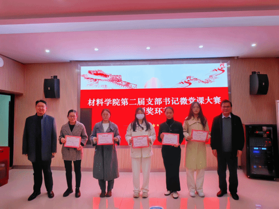 杨海波、陈恩雨等分别为获奖选手颁奖并合影留念。本次决赛角逐出一等奖1名,二等奖3名,三等奖5名和优秀奖8名,材料物理系党支部的邓泉荣老师获得本次微党课大赛的第一名。