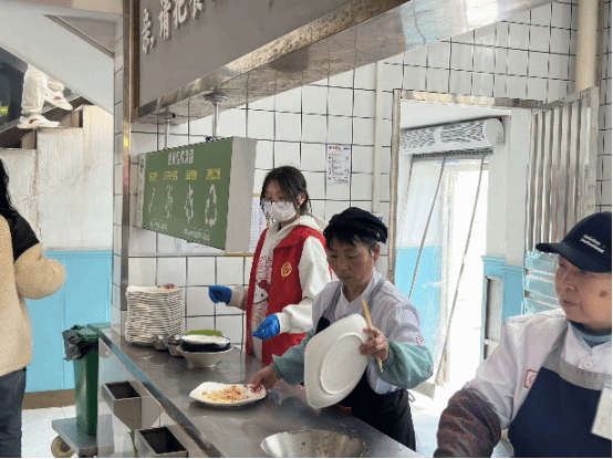 食堂门口、打菜窗口、就餐座位旁、垃圾回收处,都能看到“小蓝钻”们身穿红色马甲服务的身影。他们秉承“全心全意为同学服务”的宗旨,引导同学们有序排队打饭、自觉收拾餐具,并帮助工作人员,清理餐桌,保持食堂环境的整洁,尽心尽力维护食堂就餐秩序,引领文明就餐新时尚。