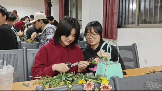 很多同学是第一次接触插花,杨雪详细介绍了工具的使用方法、插花的常用手法、每种花材的名称和作用,并一个步骤一个步骤带着同学们进行插花作品的创作。“月季属于团块状花材,可以当主花,3支月季的位置构成一个三角形是最好看的”在杨雪的带领下,同学们分成小组纷纷开始了创作。