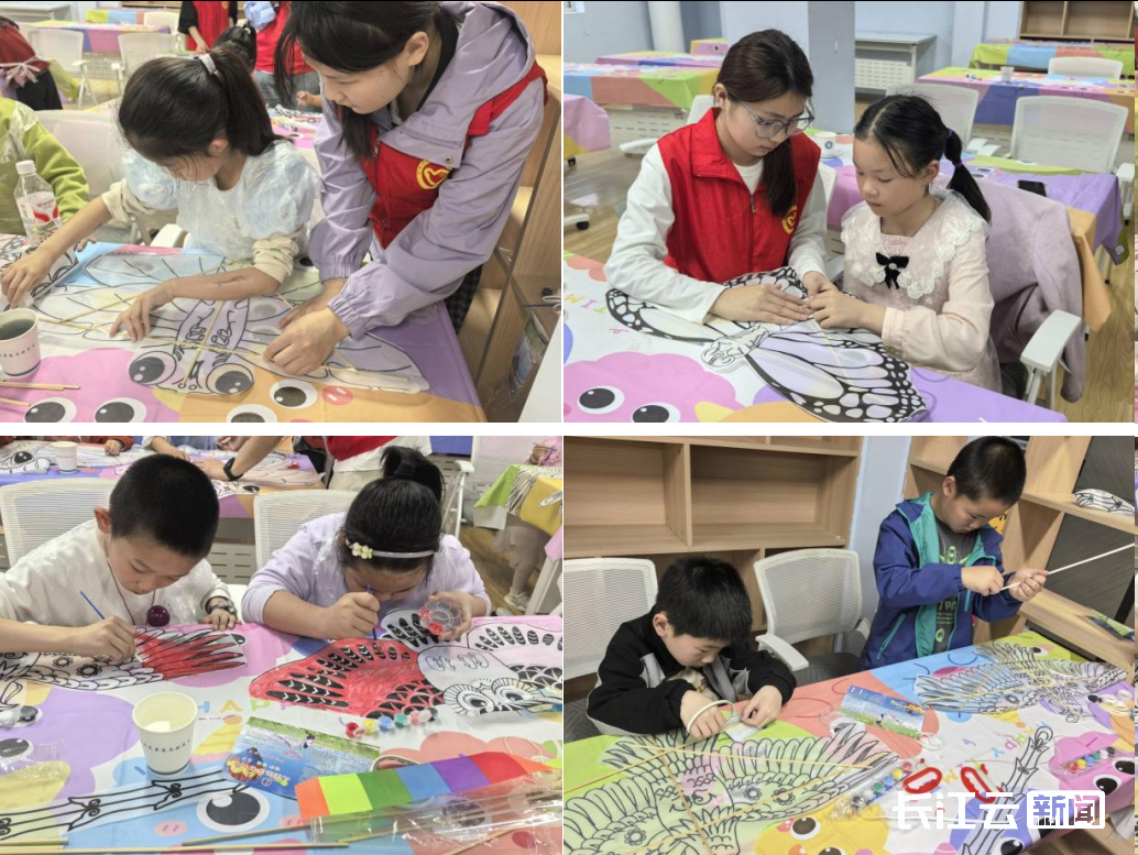 理论科普结束后,手工体验环节有序开展。为保障每位孩子都能深度参与,志愿者们采取一对一贴心陪伴模式,从风筝骨架搭建、风筝线固定到创意彩绘,每一个步骤都细致讲解、手把手示范。孩子们充分发挥想象力,用彩笔在素白纸鸢上勾勒创意,粉色蝴蝶、绿色蜻蜓、五彩老鹰等作品相继诞生,一只只纸鸢在稚嫩的画笔下变得色彩斑斓、独一无二,既锻炼了孩子们的专注力与创造力,更让他们在动手实践中真切触摸传统手工艺的温度。